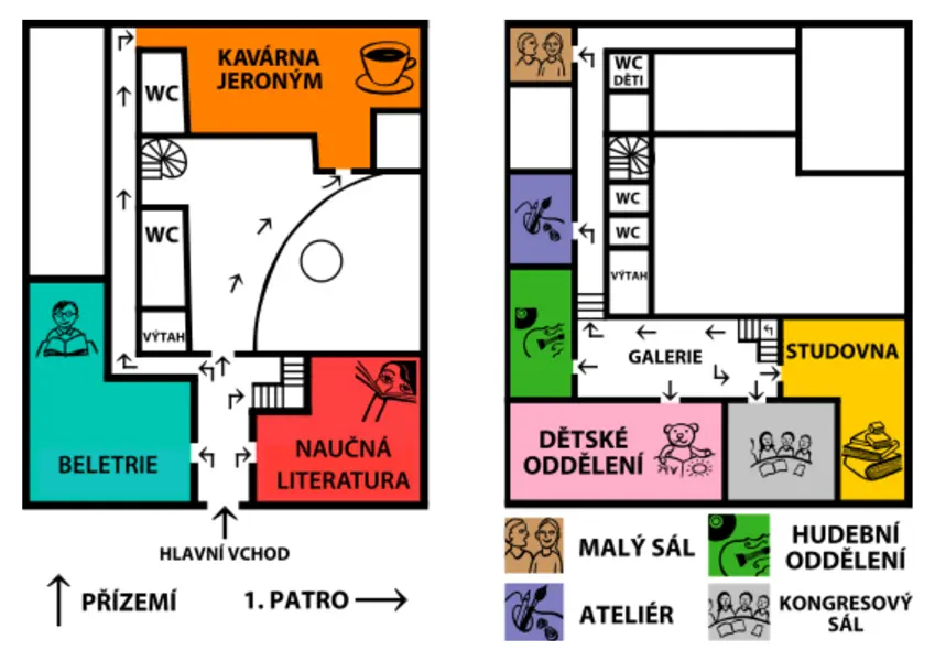 Při tvorbě propagačních materiálů se snažíme držet aktuálních trendů, v knihovně držíme linii malého vizuálního smogu. Pro lepší orientaci v knihovně máme u vstupu mapu s piktogramy, které se poté opakují u každého oddělení.